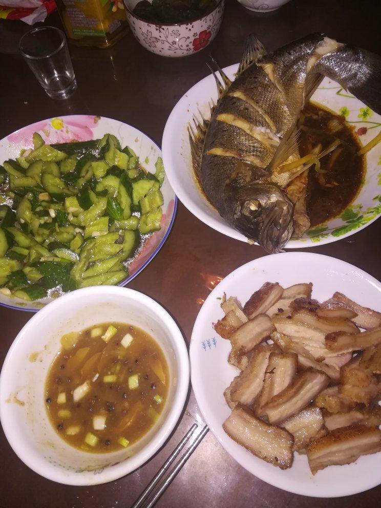 凉拌黄瓜,蒸鲈鱼,咸五花肉