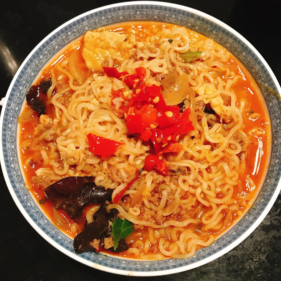 夜游神ECG 做过 晚餐•2018年1月25日 上海的第一场雪,回家路步履维艰,小心翼翼不想摔倒,所以坚决不叫外卖。最简单的煮泡面,木耳洋葱炒鸡蛋,澳洲西冷🥩剁碎➕郫县豆瓣制成的肉酱,最喜欢的剁椒酱少许。下雪天🍜➕青柠气泡水➕纳尼亚传奇🎥的搭配,实在不能更满意。 #晚餐•2018年1月25日# 2018-01-25