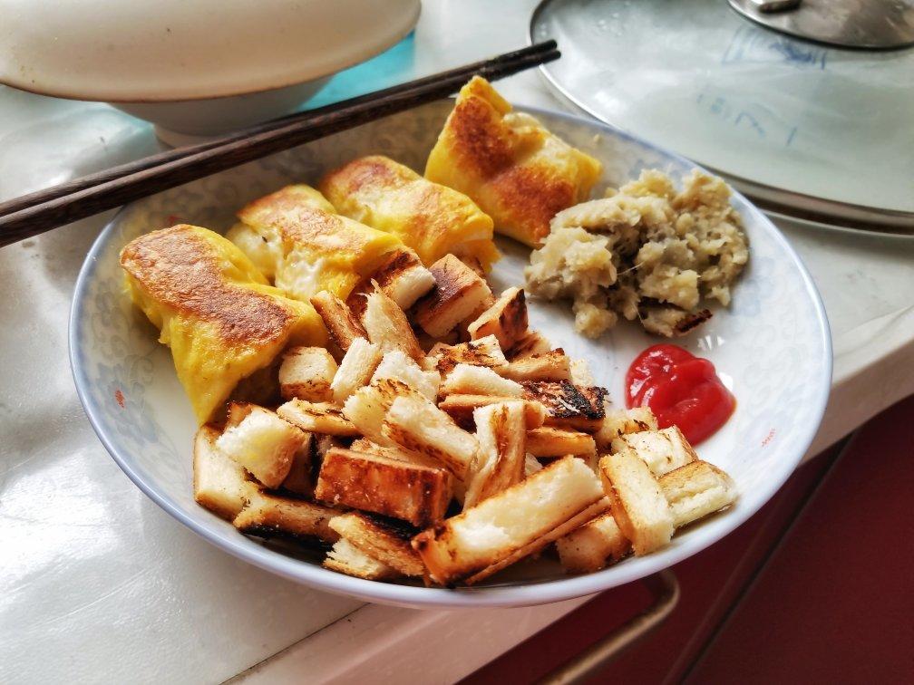 用平底锅煎的,taste good!吐司边煎成了面包干,脆脆的好吃而且不浪费,旁边是没用完的红薯泥
