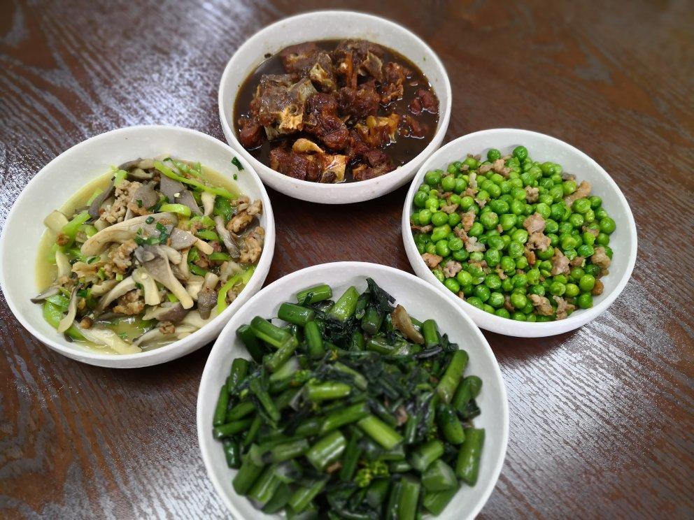 1月30日午饭。红菜苔,青椒平菇,卤排骨,豌豆肉末。