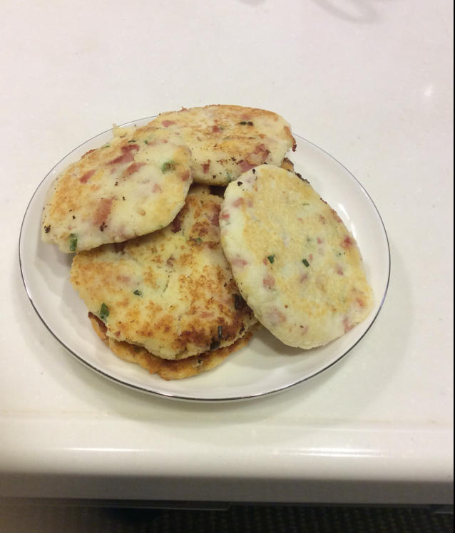 放了点午餐肉和葱花 味道不错 煎的时候发现很耗油