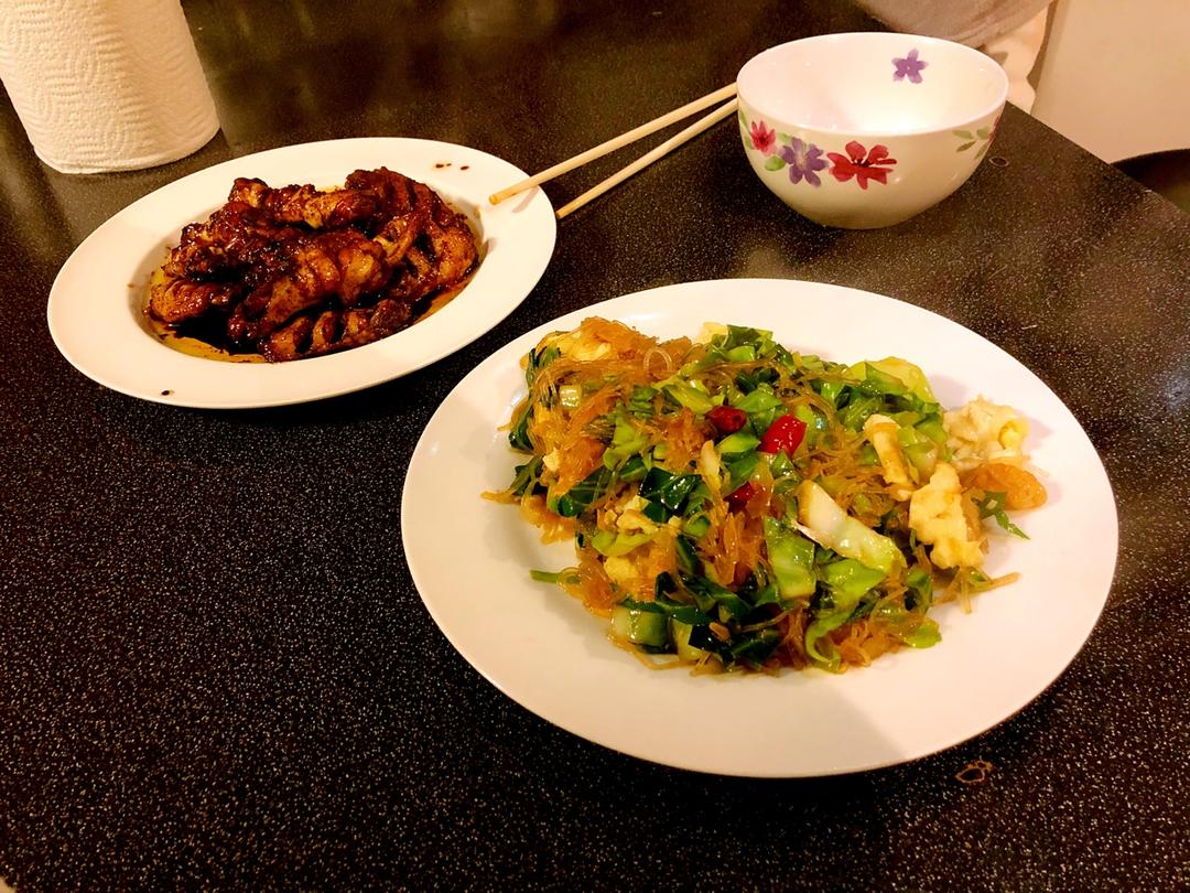 AnneleseLin 做过 晚餐•2018年1月30日 包菜粉丝炒鸡蛋:腐国的包菜叶子有点干 水分很少 所以炒的时候加了一大勺开水进去,对口感有帮助~喜欢加老抽和蚝油,上了色的粉丝更有食欲。有可乐鸡翅血统的红烧鸡翅,做完满屋子的焦糖味~ #晚餐•2018年1月30日##Triangle的日常# 2018-01-31