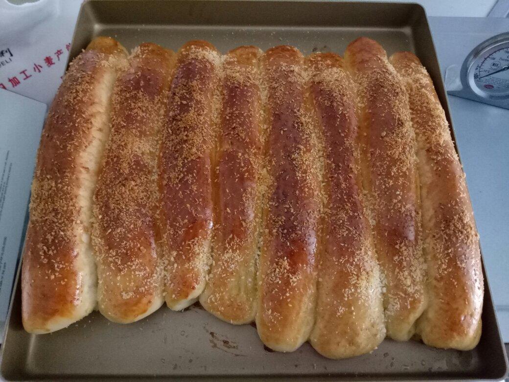 高粉300克,牛奶190克,蛋液30克,糖30,盐3,酵母5。150度,20分钟