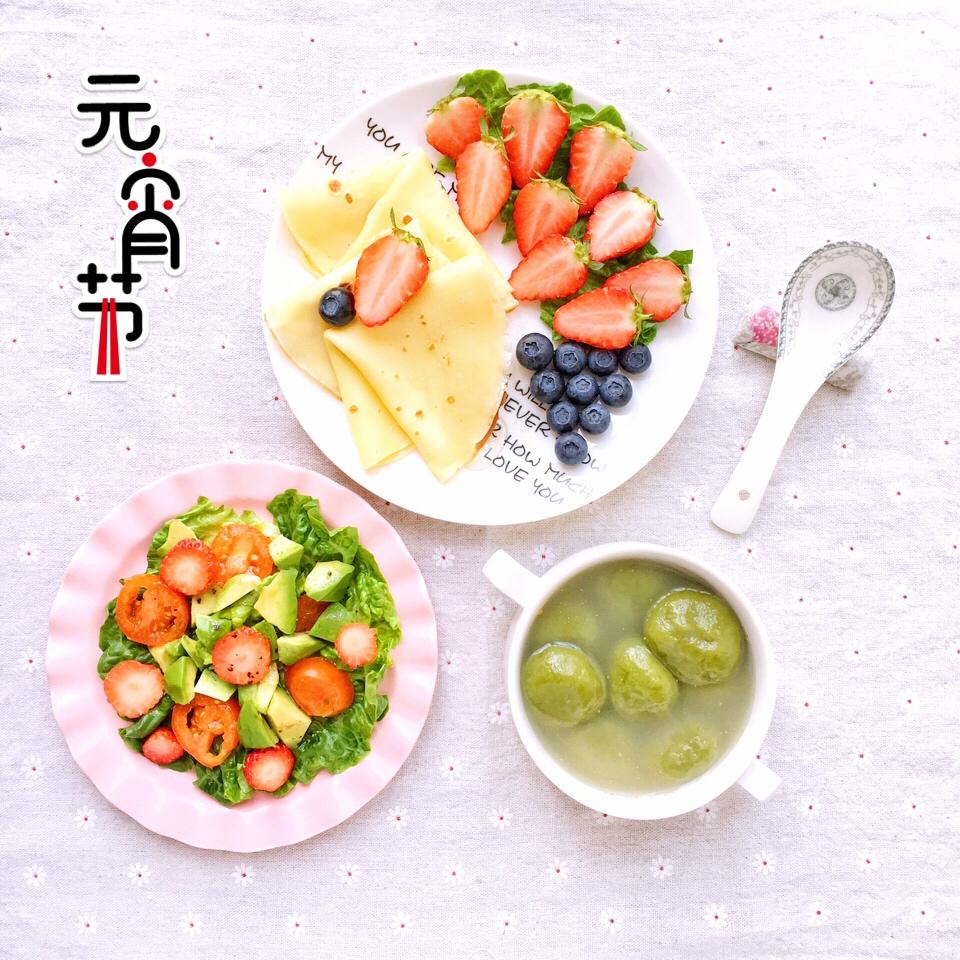 草莓煎饼、蔬果沙拉、抹茶巧克力汤圆。