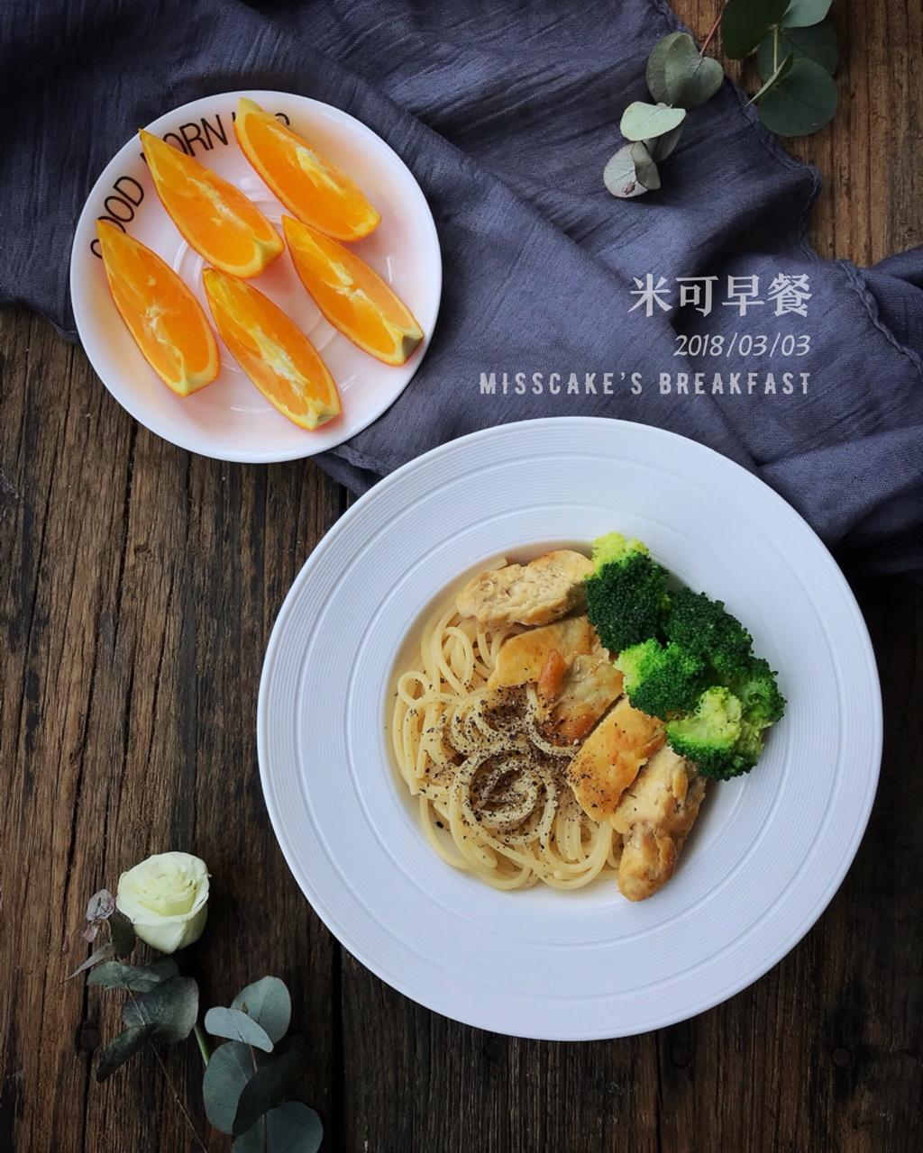【我的365个早餐系列】D354:煎鸡胸肉,煮西兰花,煮意面(黑胡椒、盐、醋),冰糖橙。ps:意面煮好后本来只放了黑胡椒和盐,实在难以下咽,加了醋改善一下口感,最近的体重让人忧心忡忡,再像原来那样没节制的吃下去,胖成球指日可待。周末早~