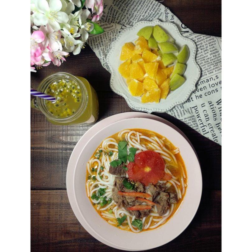 红烧牛肉米线/蜂蜜百香果汁/水果