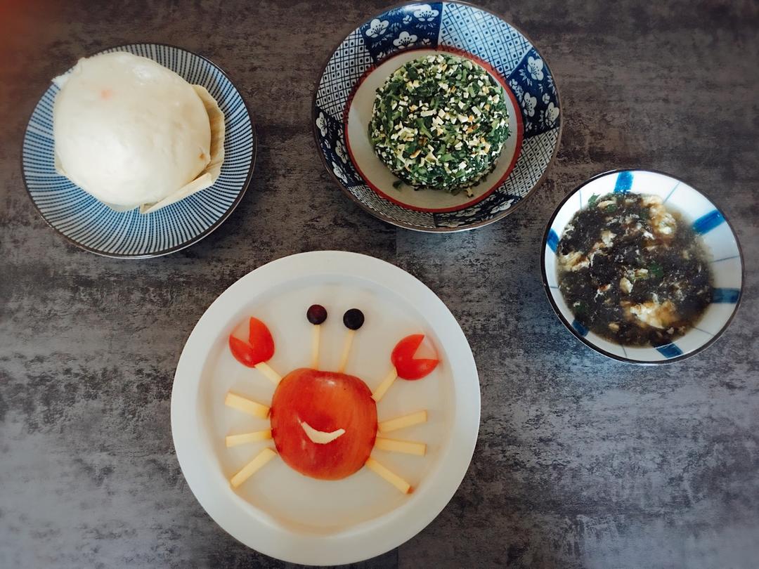 早餐:香干马兰,紫菜蛋花汤,豆包,苹果