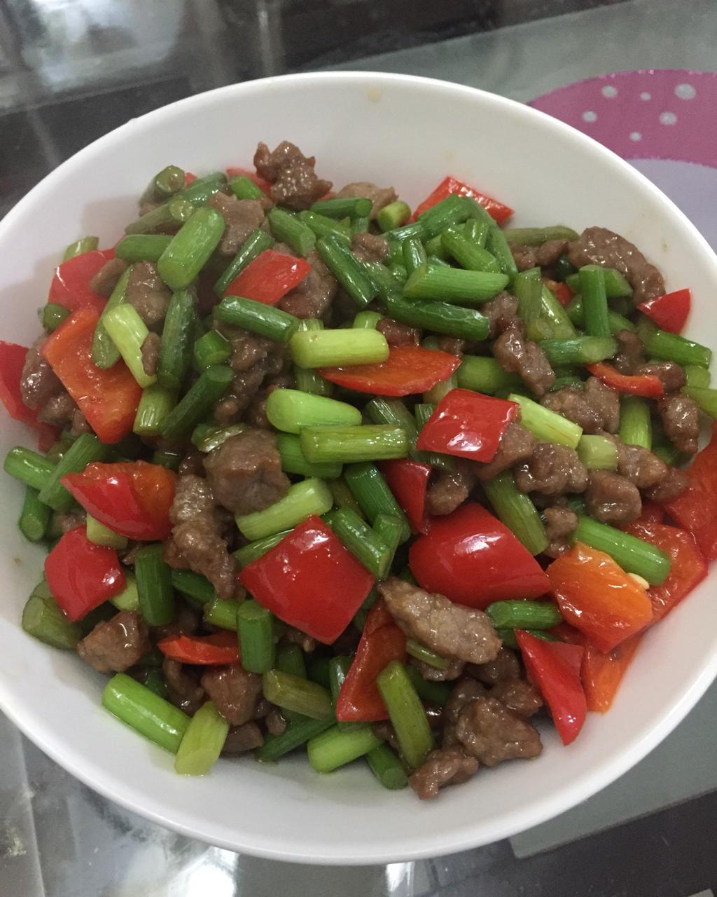红红火火的蒜苗炒牛肉,西红柿炒鸡蛋,妥了~