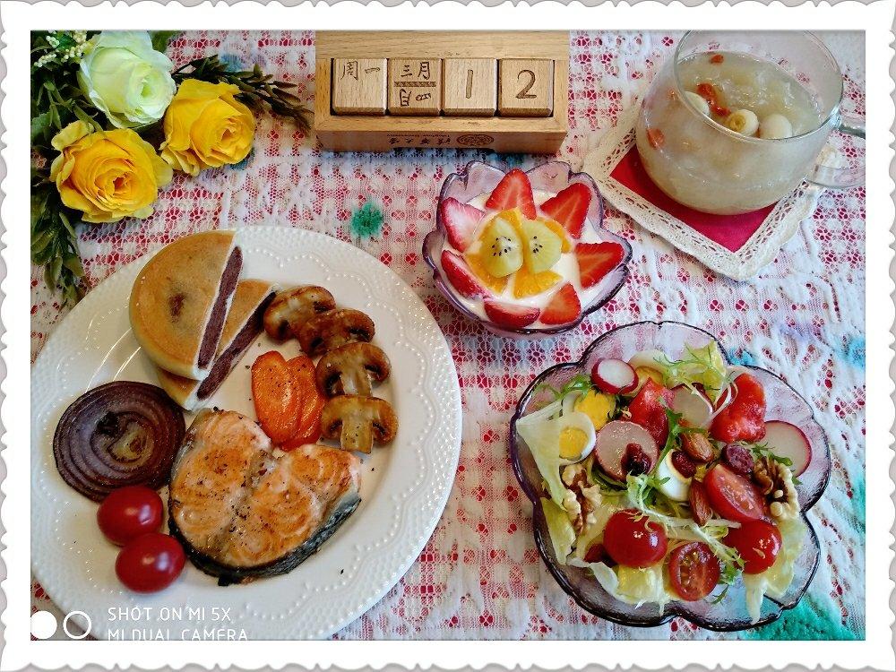红豆饼,煎三文鱼,鹌鹑蛋蔬菜沙拉,水果酸奶,银耳莲子雪梨汤