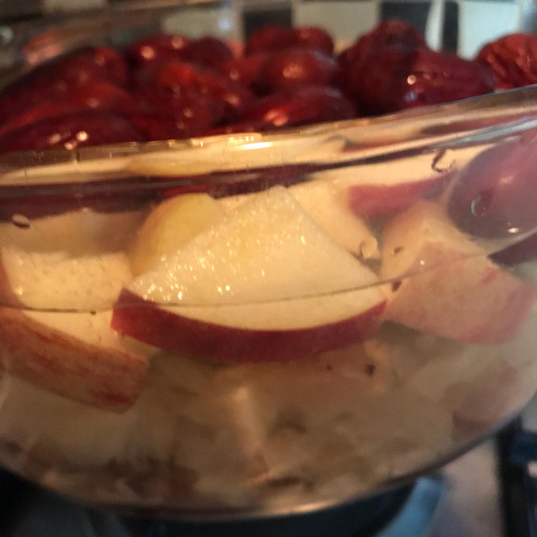 潘安达 做过 午餐•2018年3月22日 分享一道最近常做的甜食:大枣苹果银耳桃胶羹 - 不要放糖,银耳桃胶提前泡发一晚,水量要少-炖到苹果基本融化,出果胶就可以了 #午餐•2018年3月22日# 2018-03-22