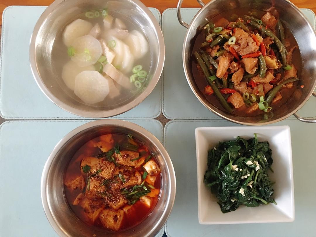 麻婆豆腐,红烧椒麻火鸡肉,凉拌菠菜,萝卜连锅汤