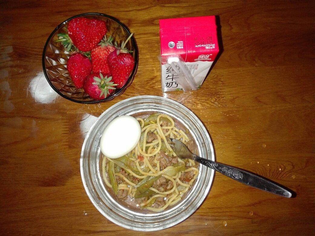 安宝早餐:牛奶、草莓、煮鸡蛋、羊肉扁豆西红柿焖玉米面条。
