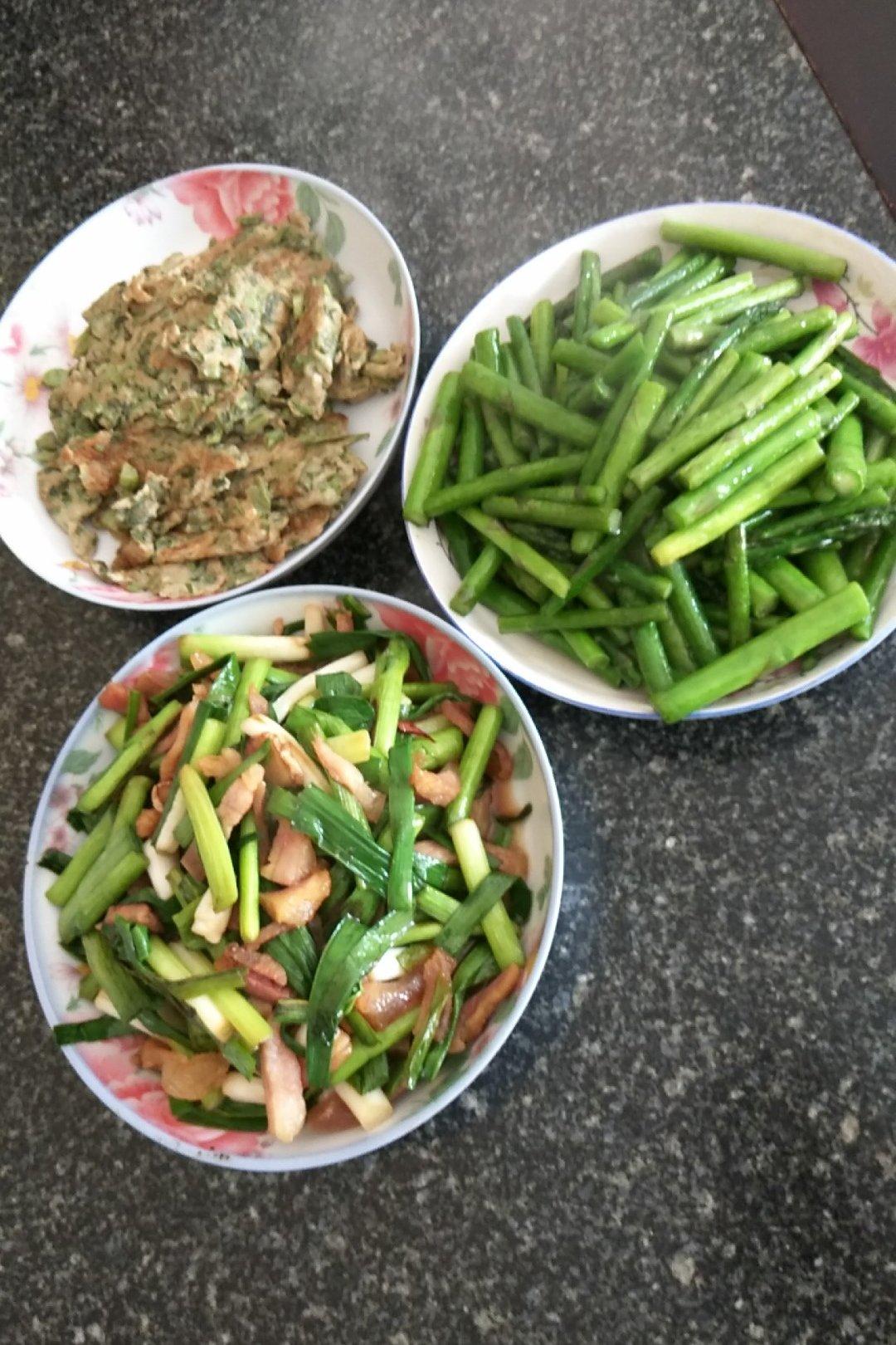 清炒笋子,鸡蛋炒香椿芽,蒜苗炒肉,,自我感觉这菜炒的可以啊,结果我老公说太难吃!泄气!