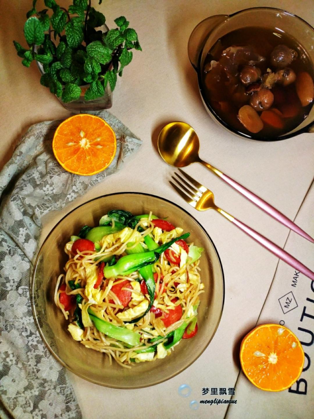早餐打卡:火腿青菜炒面+桂圆红枣汤+水果