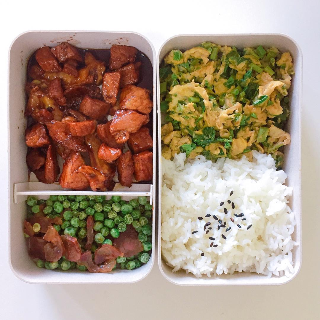 红烧肉➕香椿炒蛋➕腊肠炒青豆。
