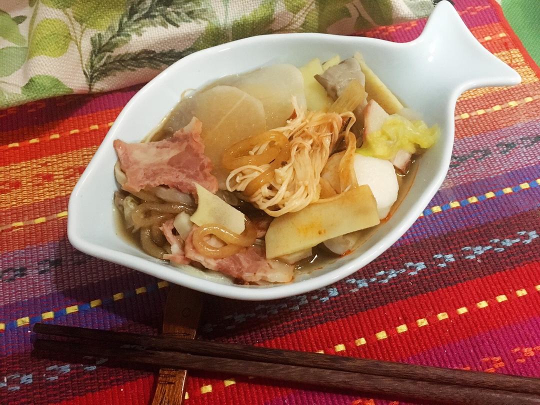 好想_做只猫oo 做过 晚餐•2018年4月13日 加餐22:21酸辣粉(红薯粉、白萝卜、冬笋、平菇、金针菇、团生菜、培根🥓、鱼丸)好饿好饿,最近长了好多肉,今天早上又涨了一斤,不敢吃太多,但是好饿 #晚餐•2018年4月13日##郝小妹要多吃菜菜🤗##🍝🍛粥粉面饭🍚🌮# 2018-04-13