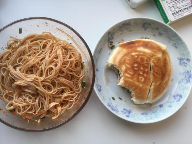一个人~山寨油泼面、肉夹馍,味道还是很不错的