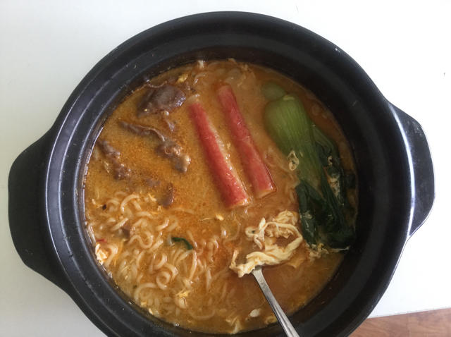 煮方便面~加了肥羊卷、蟹肉棒、青菜、鸡蛋、芝士的好好吃啊,尤其是汤特别浓