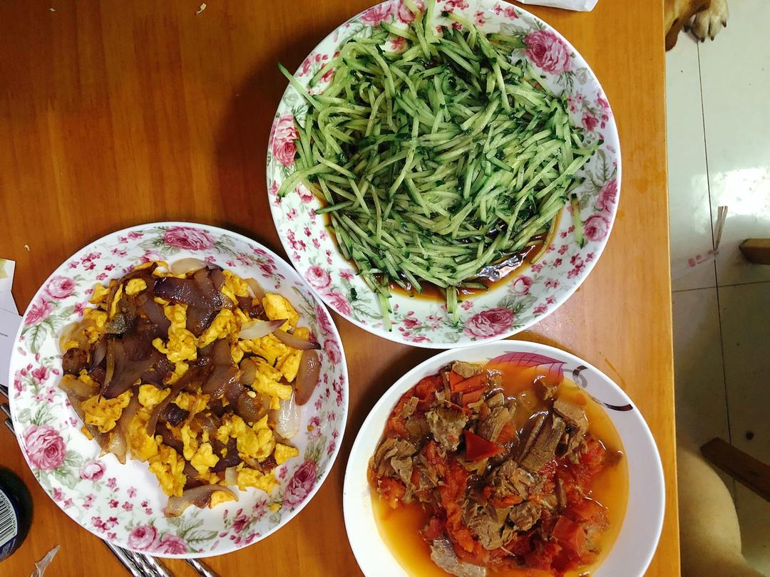 洋葱炒鸡蛋 拌黄瓜 番茄牛腩