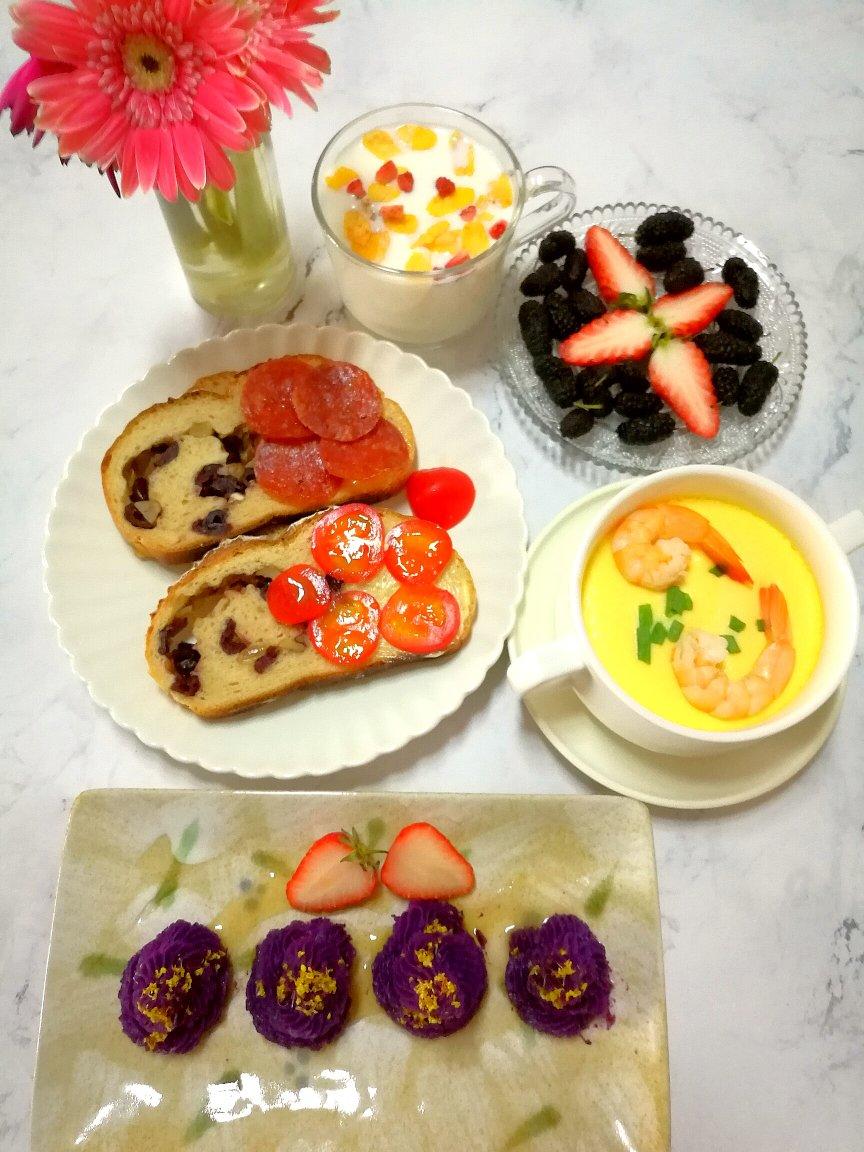 早餐:桂花紫薯泥+全麦面包salami+鲜虾蒸蛋+桑椹+牛奶麦片💓