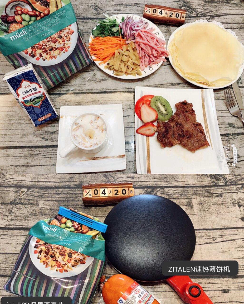 桦桦0330 做过 早餐•2018年4月20日 为家人做份营养早餐,让家人每天活力无限,爱家,爱生活,爱健康!全球时刻提醒⏰您:每天一定要记得吃早餐[微笑]🥇ZITALEN快捷速热薄饼机🥈ica 50%坚果燕麦片 🥉国顺火腿🏅新疆千初牛奶🥛 #早餐•2018年4月20日# 2018-04-20