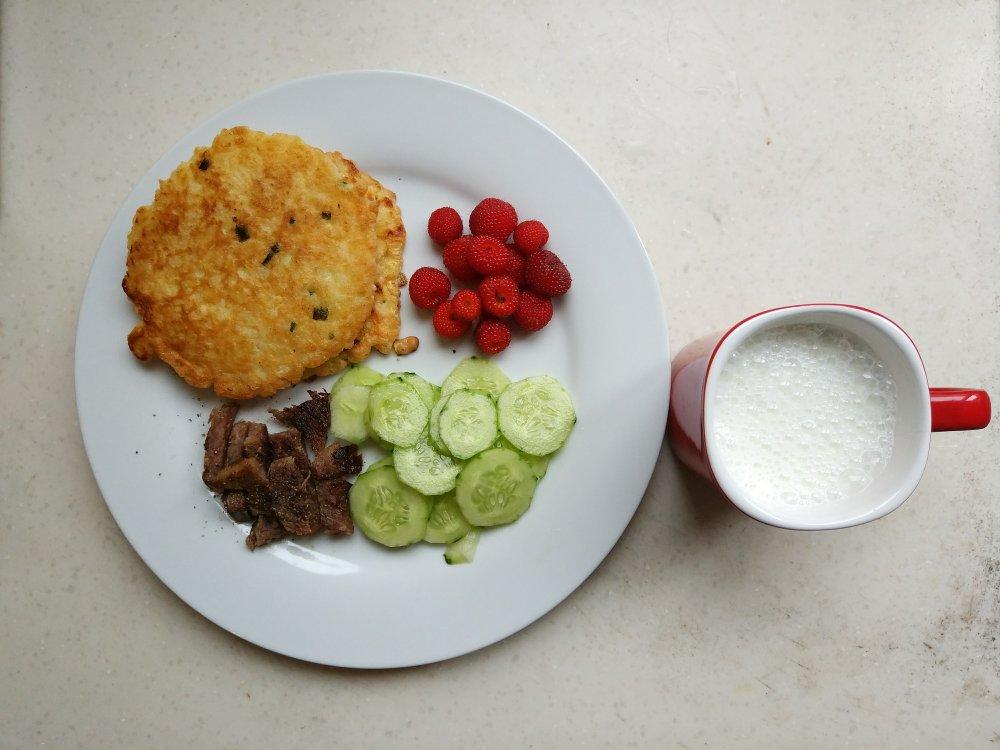 米饭煎饼,煎牛肉,凉拌黄瓜,野草莓