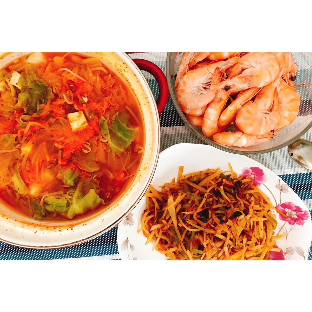 泡菜汤,虾,辣炒土豆丝