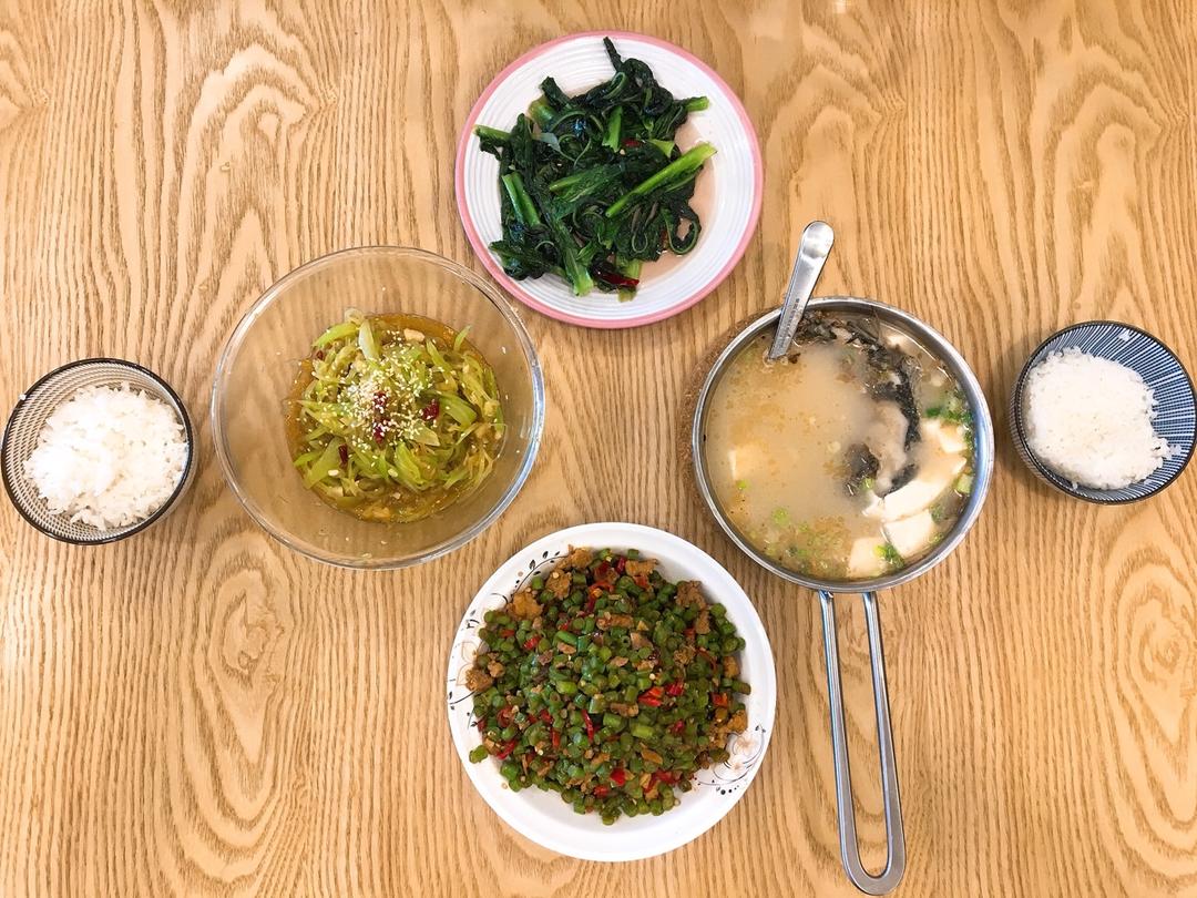 凉拌莴笋丝➕清炒莴笋叶➕肉末豆角➕鲫鱼豆腐汤...