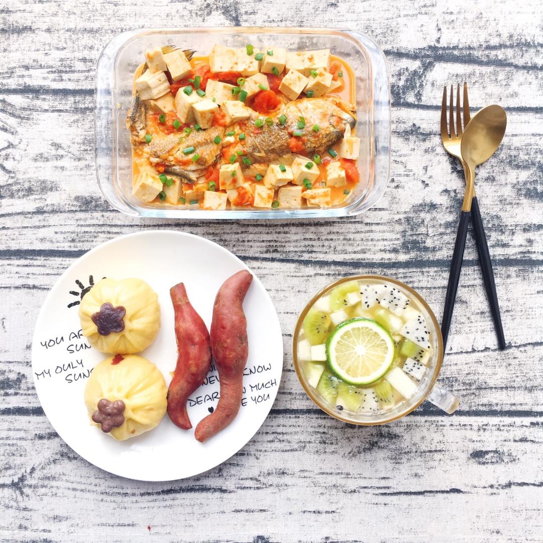 豆沙包、小红薯、番茄豆腐煲黄鱼、百香果蜂蜜水果饮。