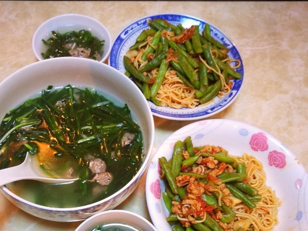 西红柿豆角焖面,韭菜牛肉丸汤。和闺蜜(❁´ω`❁)