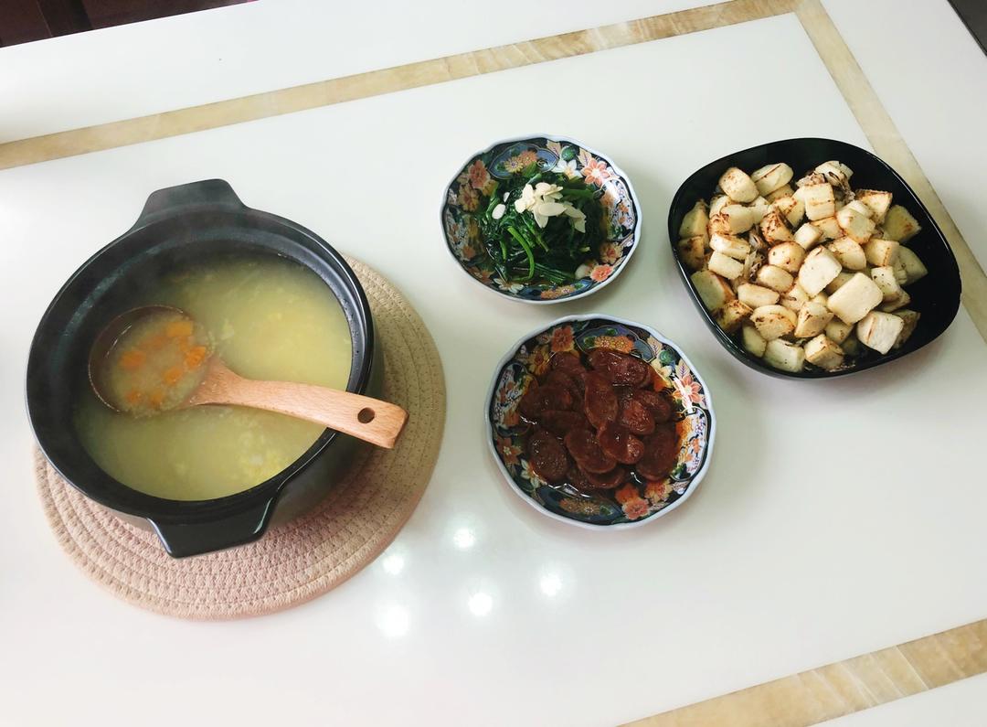 早安☀️炒馒头,咸香肠,杏仁菠菜,小猪排,红薯小米粥。