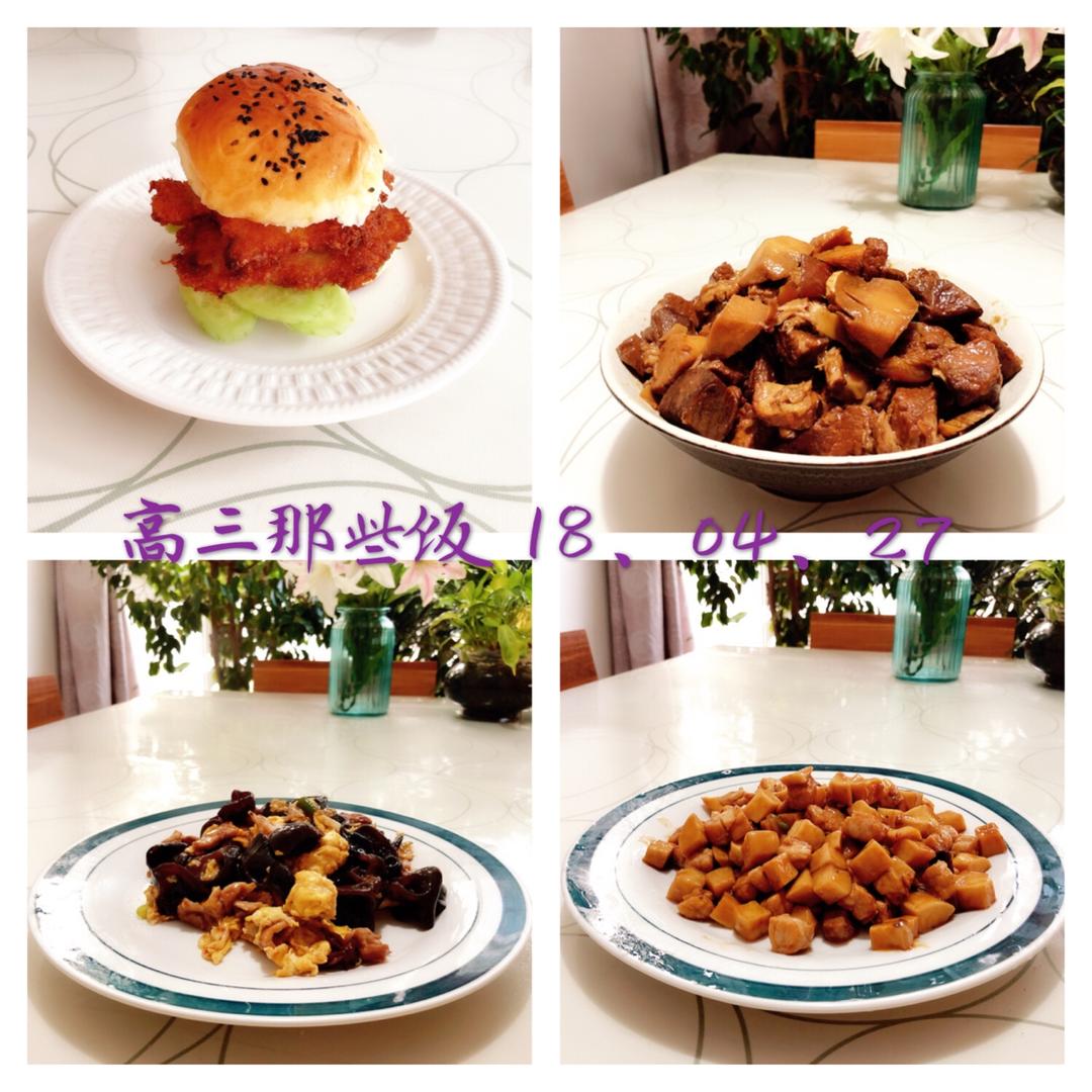 鸡排汉堡、冬笋炖肉、醋溜苜蓿、肉丁酱爆杏鲍菇
