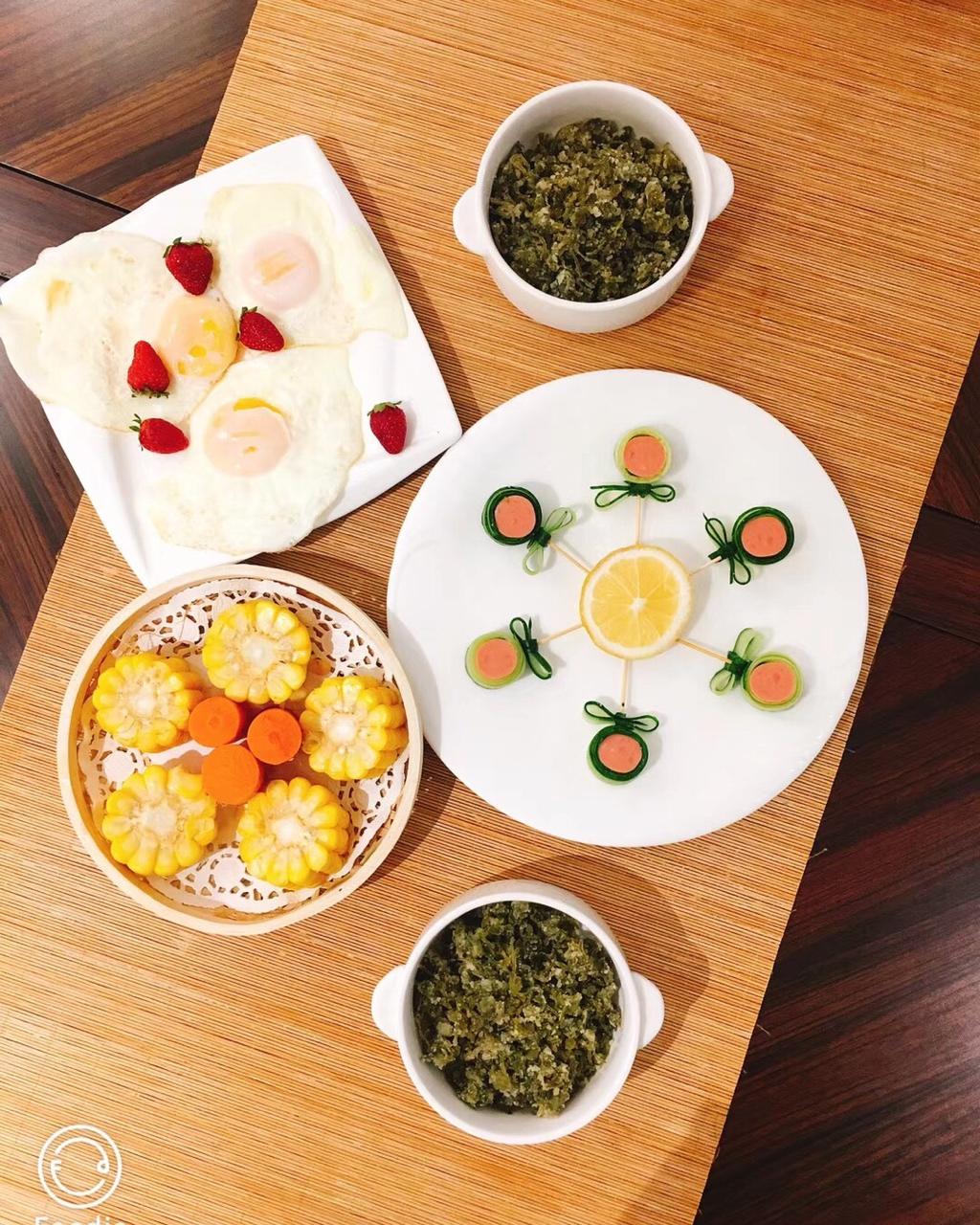 糖蒸艾草➕黄瓜火腿棒棒糖🍭➕水果玉米🌽➕煎鸡蛋🍳