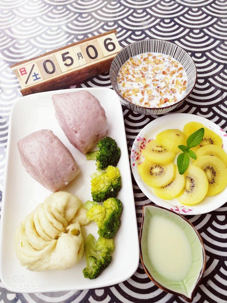 花卷,紫芥蓝刀切,水果,谷物牛奶