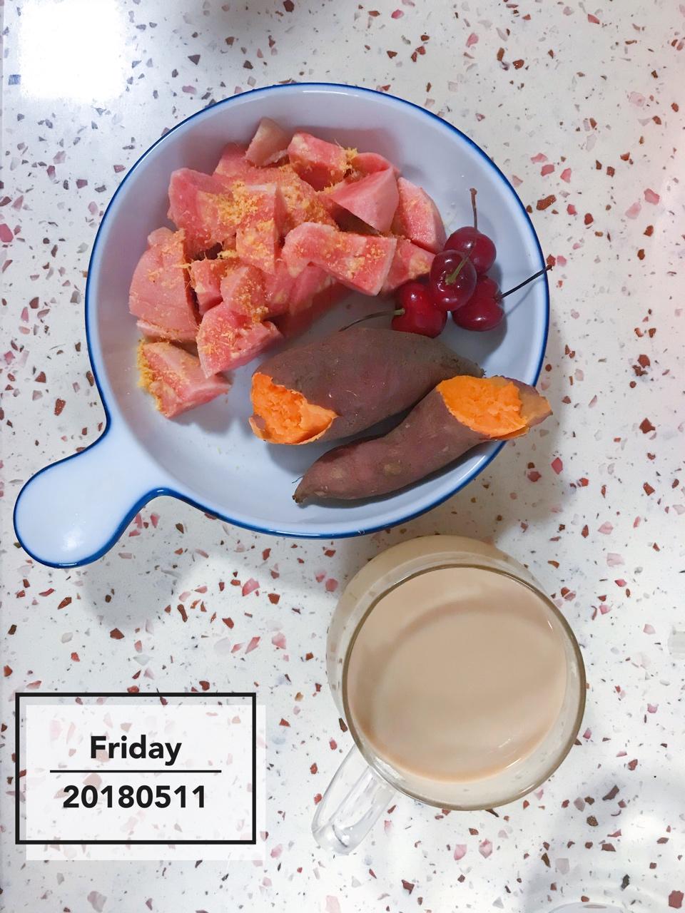红薯🍠、红心芭乐、樱桃、黑咖啡配牛奶