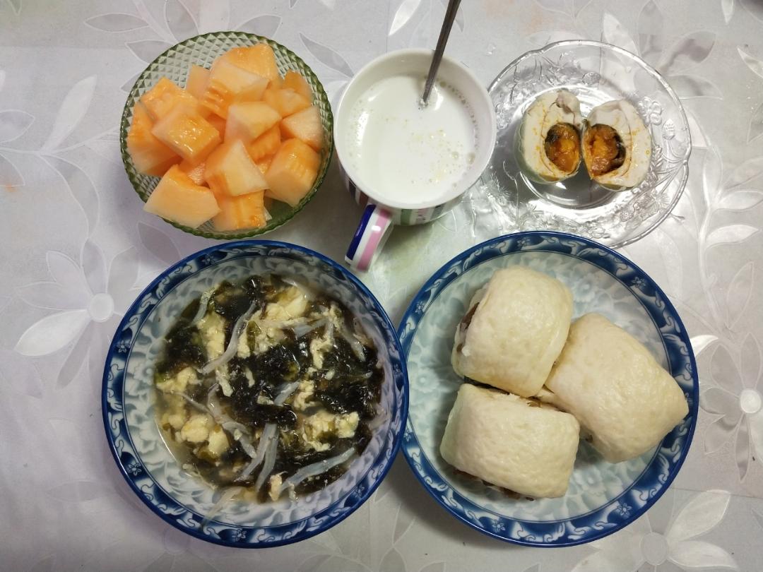小彬爱下厨 做过 早点爱上早点幸福 #早餐•2018年5月12日##小思家的早餐##初中生小思的早餐#早餐打卡第六十七天自制椰奶馒头紫菜银鱼蛋汤牛奶~咸鸭蛋蜜瓜儿子吃完上课去了大家周末愉快! 2018-05-12