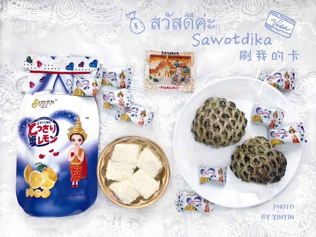 2017-8-25,“刷我的卡”是泰文“你好”的意思,这款泰国娃娃糖果的品牌就是“刷我的卡”,泰国人真够乐天幽默的。中间是椰子牛奶小蛋糕,右边是熟透了表皮发黑的小释迦,口感不如大释迦的好,感觉外形有点像泰国娃娃的帽子。冰箱贴是泰国大皇宫,到曼谷必去大皇宫,就像去北京怎能不去故宫。异域风情的建筑,红砖金瓦蓝天白云,是个拍照的好地方。我没去成曼谷,就请@Kit代我先去朝拜啦。 #早餐•2018年5月14日##早餐与冰箱贴#