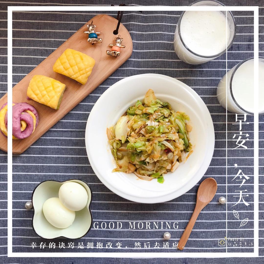 早餐打卡:火爆大头菜(以前东北的叫法,其实就是爆炒甘蓝)➕热牛奶➕水煮蛋➕彩色小馒头