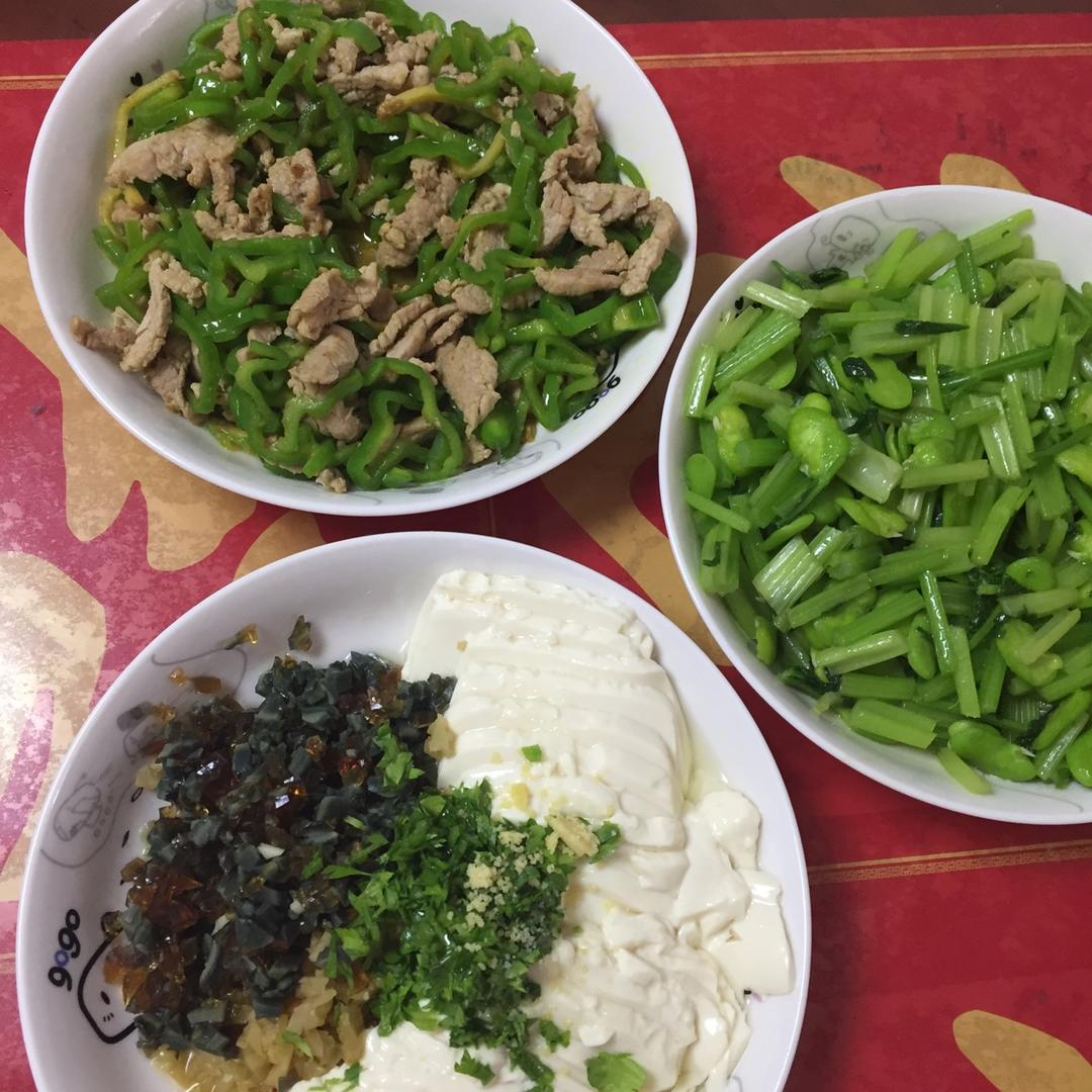 青椒炒肉丝,药芹炒豆辨,皮蛋拌豆腐,鸡蛋杂粮炒饭,今天我的晚餐,厨友们吃的什么好菜呢?