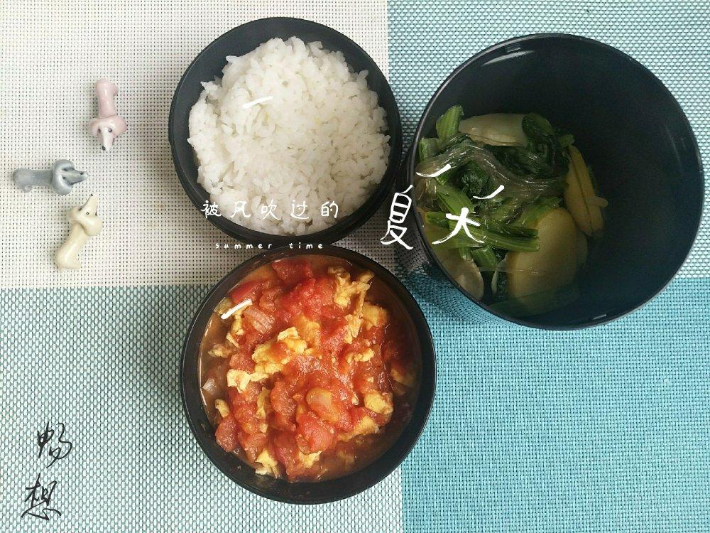 今日便当🍱:小白菜土豆片粉条,西红柿炒蛋,白米饭,畅要吃素的!😅️😅️😅️