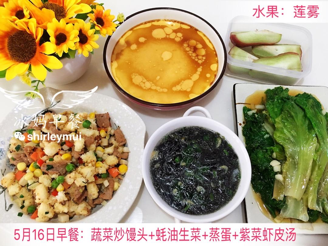 冰妈shirley 做过 二年级小朋友💓爱心早餐 💞💞二年级小朋友第68天早餐:炒馒头丁、蚝油生菜、蒸蛋、紫菜虾皮汤、莲雾 #早餐•2018年5月16日##美好的一天从美味早餐开始##营养早餐# 2018-05-16