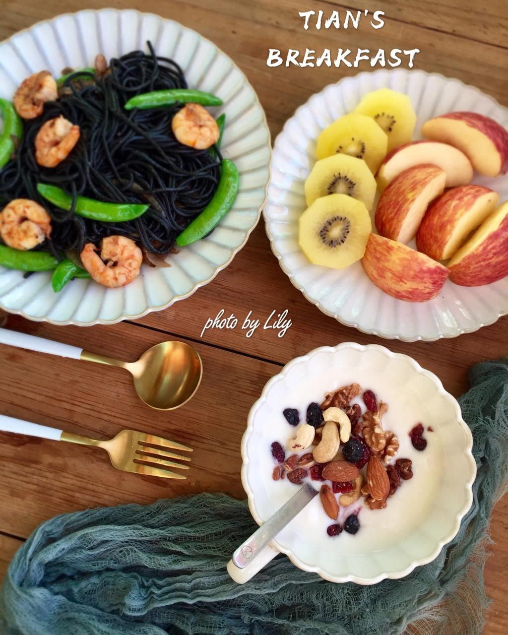 虾仁甜豆墨鱼汁意面,坚果酸奶,水果