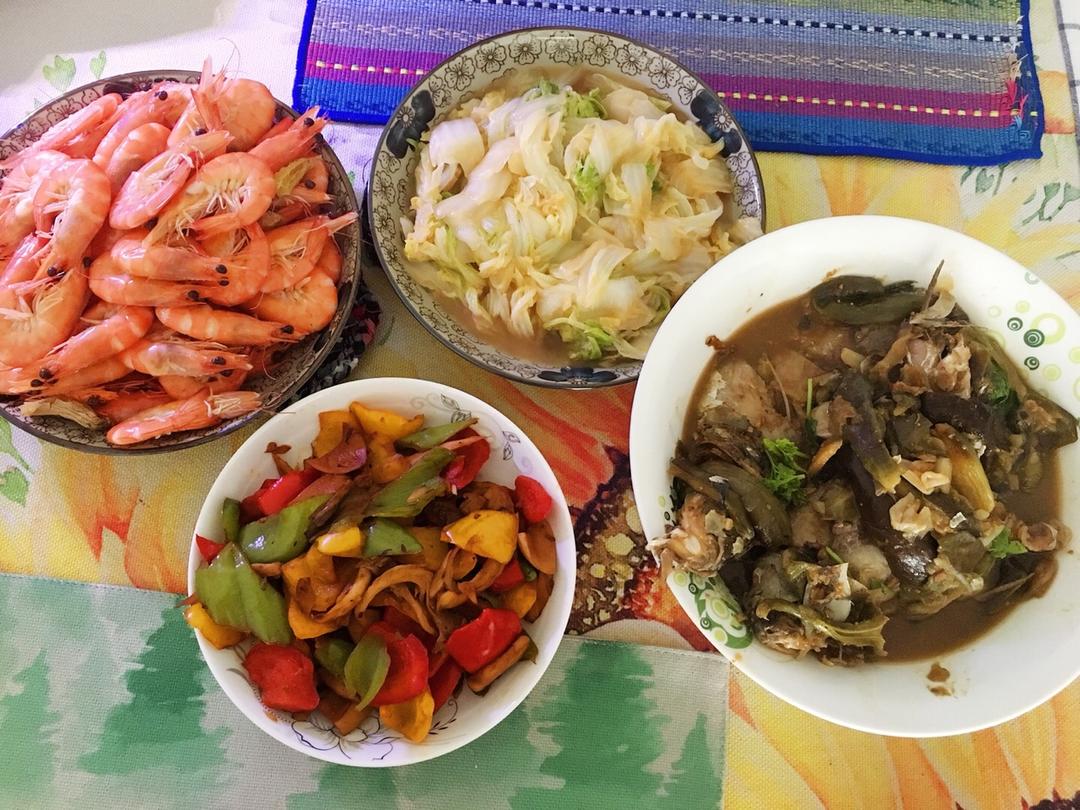 好想_做只猫oo 做过 午餐•2018年5月16日 5月13日午餐13:05鲫鱼🐟炖茄子🍆,彩椒炒杂菌,醋熘白菜,水煮虾、米饭🍚 #午餐•2018年5月16日##小红掌勺当大厨##🌵再看我就把你吃掉🌵# 2018-05-16