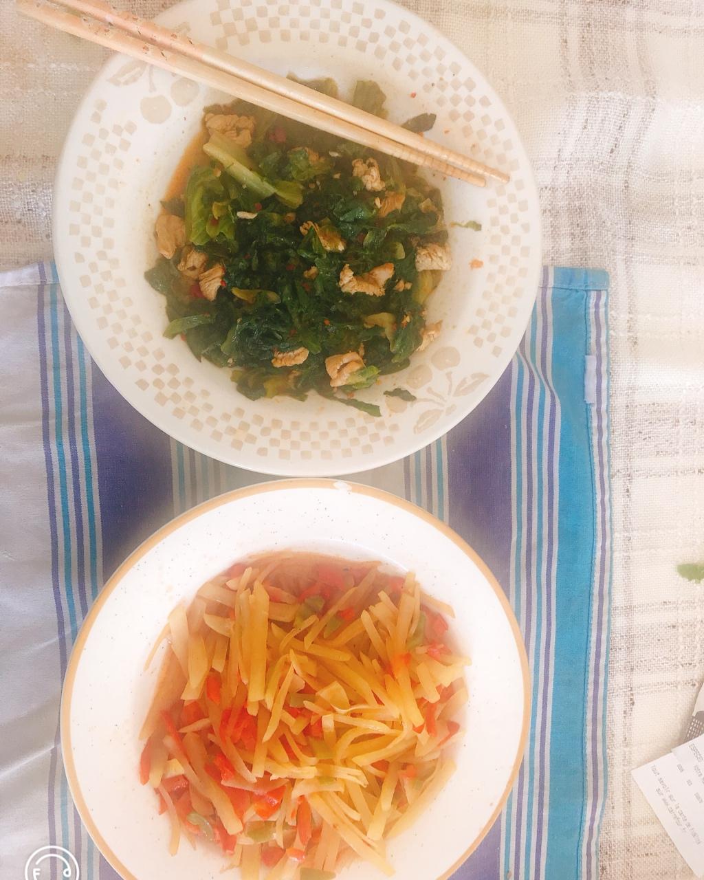 5.17 考试后的午餐。舍友做的两道菜:生菜辣炒鸡丁,青椒土豆丝。还有朋友买的杂粮米。