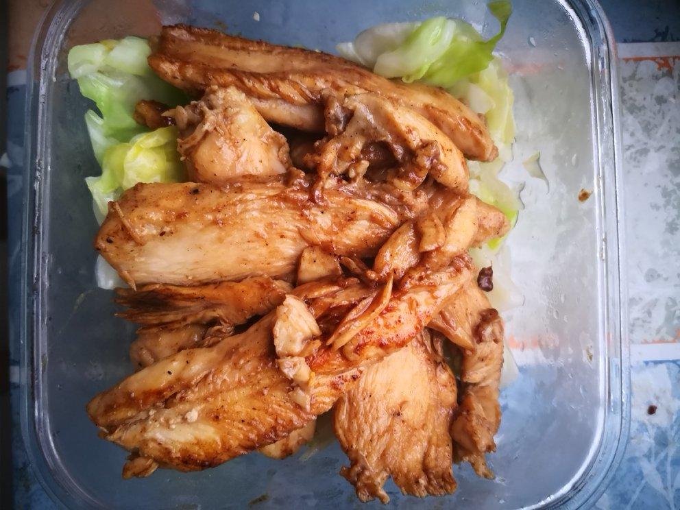 清炒卷心菜,香煎鸡胸肉,烤小鲳鱼