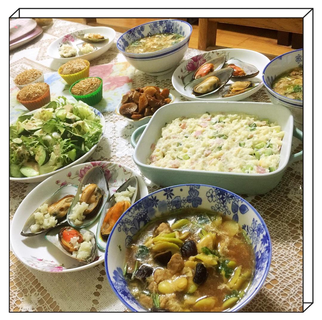 忙活大半天就为了吃!土豆沙拉,蔬菜沙拉,清蒸青口贝,蚕豆糊,蔓越莓奶酪黑啤面包!