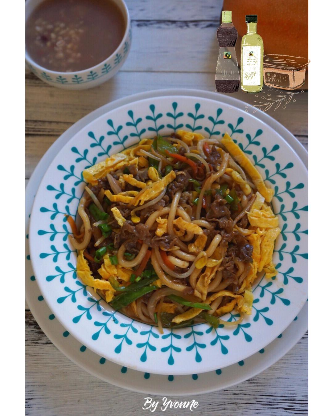 早餐:红豆粘玉米碴子粥,鸡蛋时蔬炒乌冬面。