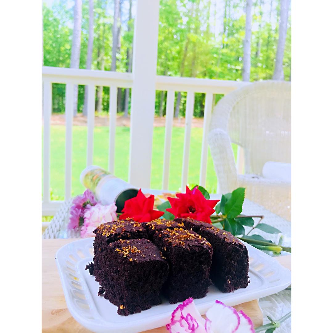我非常认真的承认我就是个粗暴的人。😂       本来做好的心形黑米糕,想跟老妈来个520。结果做好的漂亮的黑米糕被我活生生磕烂了。😭  只好切块凑合拍照了。😳 但不影响吃😂 掐两朵自家种的玫瑰🌹 配合一下😂 #午餐•2018年5月20日#
