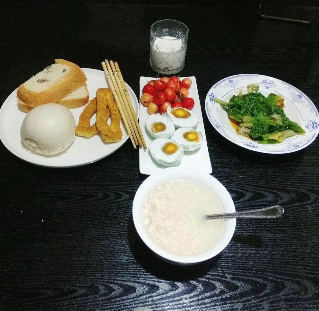 早安!燕麦粥牛奶土司馍馍咸鸭蛋小菜樱桃,二人食。