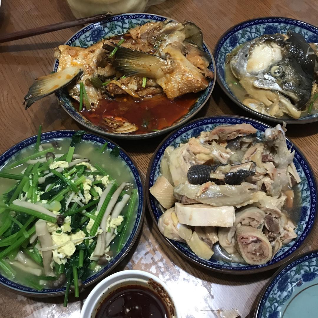 红烧三文鱼头白斩鸡素炒菠菜